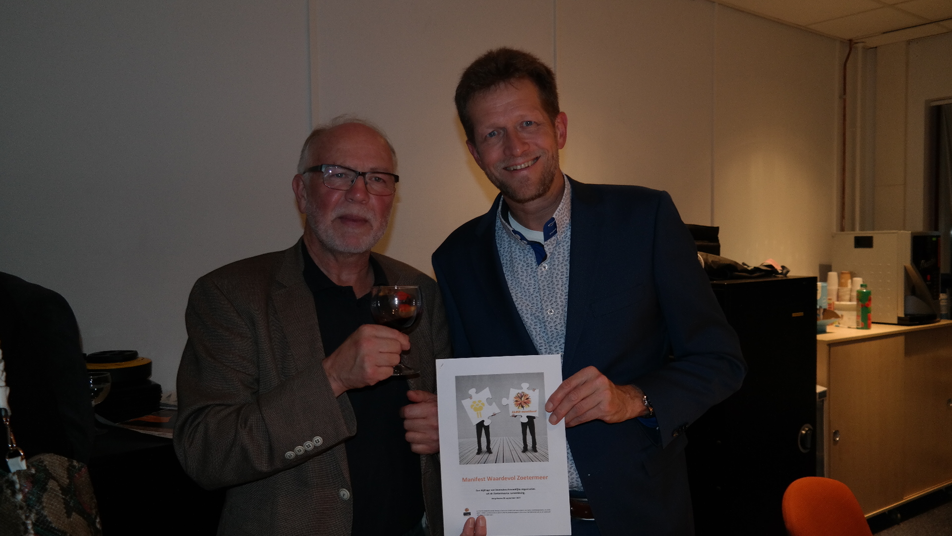 ChristenUnie-SGP commissielid Arco Weening krijgt het Manifest Waardenvol Zoetermeer overhandigd van Flip Bakker van het ILOZ