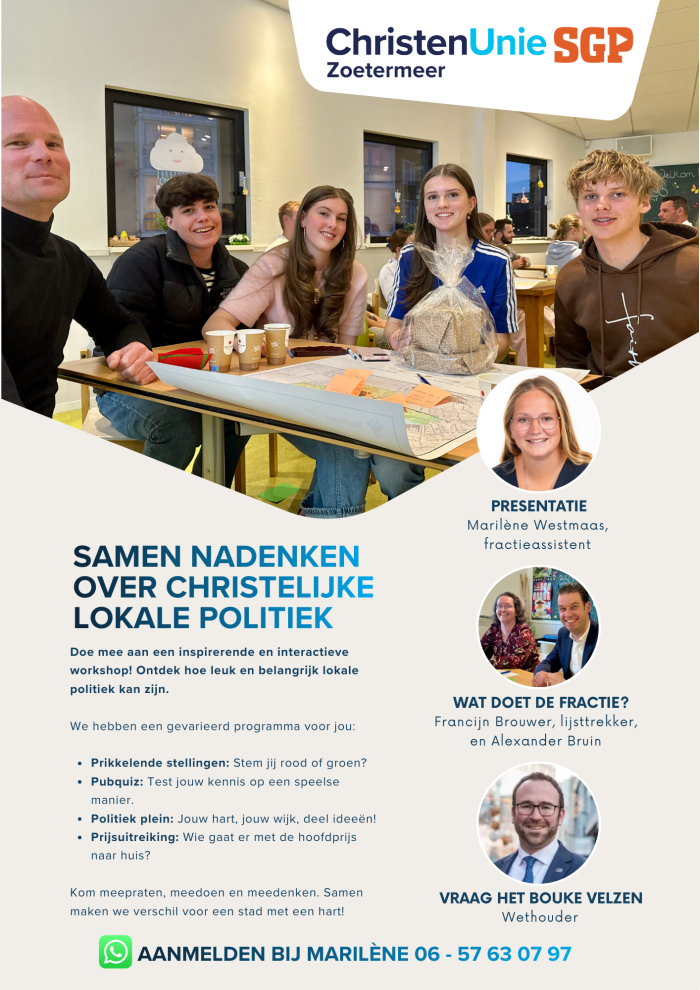 Tijdens deze interactieve workshop van circa 2,5 uur gaan we samen op zoek naar antwoorden. We testen onze kennis van de lokale politiek, delen ideeën voor de wijk en spelen een quiz – mét een leuke prijs voor de winnaar! Het wordt een inspirerende en praktische bijeenkomst waarin u ontdekt hoe geloof en politiek elkaar raken.