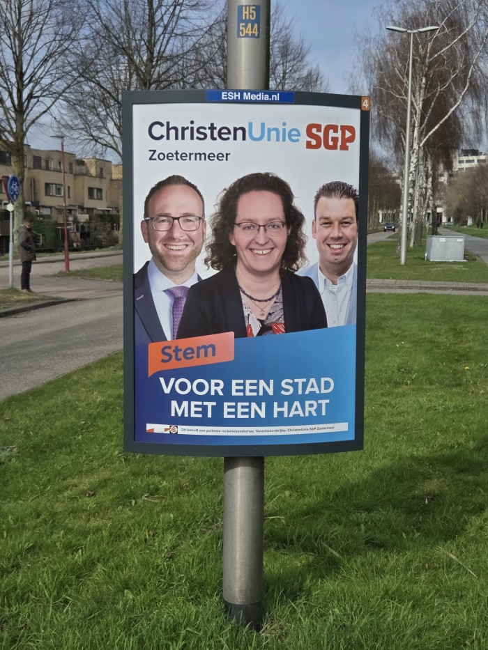 Verkiezingsposter van de ChristenUnie-SGP in Zoetermeer met van links naar rechts wethouder Bouke Velzen, fractievoorzitter en raadslid Francijn Brouwer-Weemhoff en raadslid Alexander Bruin.