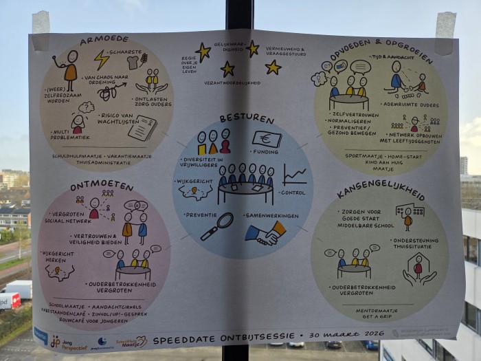 Er waren diverse tafels over een verschillend thema ingericht voor speeddate gesprekken, te weten tafels over het thema Armoede, het thema Opvoeden & Opgroeien, het thema Ontmoeten, het thema Kansengelijkheid en het thema Besturen. Aan de tafels werden ondertussen verse croissantjes en belegde broodjes geserveerd.