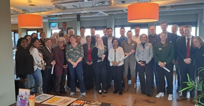 Groepsfoto van de deelnemende raads- en commissieleden samen met de professionals, vrijwilligers en bestuursleden van de organisaties Jong Perspectief, Humanitas, SchuldHulpMaatje en JongSenioren uit Zoetermeer.